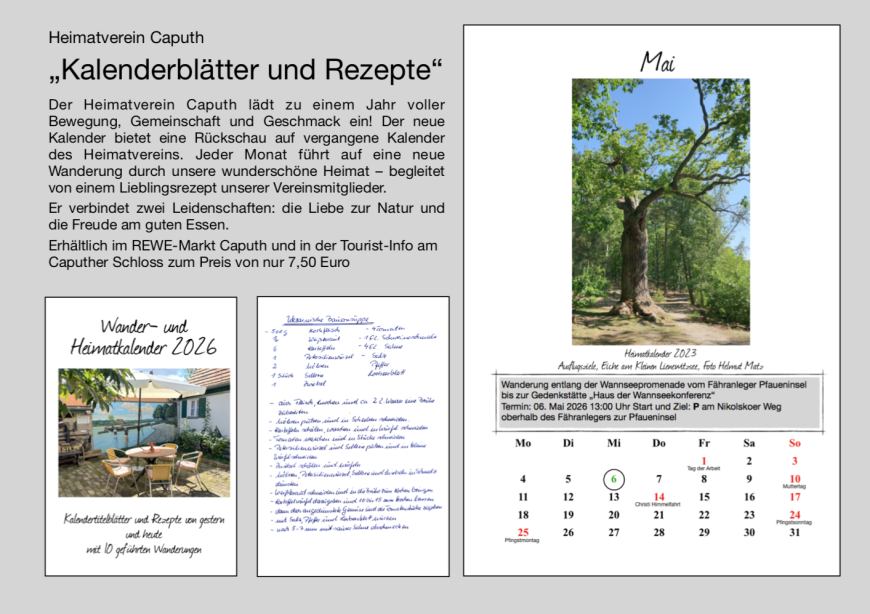 Falls sie noch ein kleines Weihnachtsgeschenk brauchen: Der neue Wander- und Heimatkalender liegt zum Preis von 7,50€ im REWE Caputh und in der Tourist-Info am Caputher Schloss bereit.